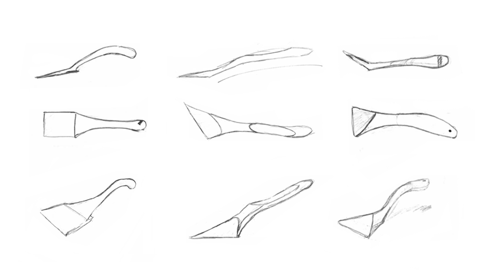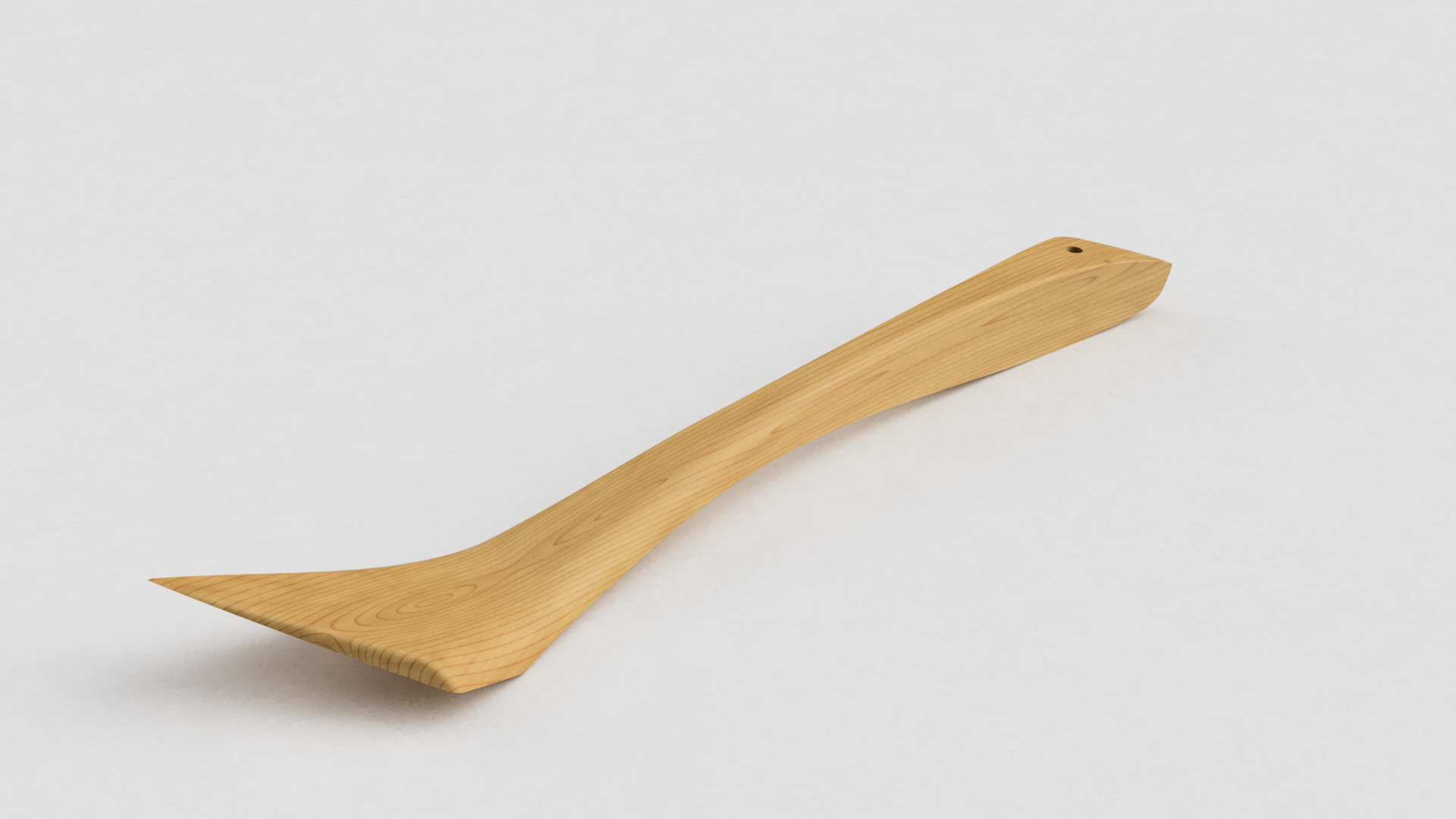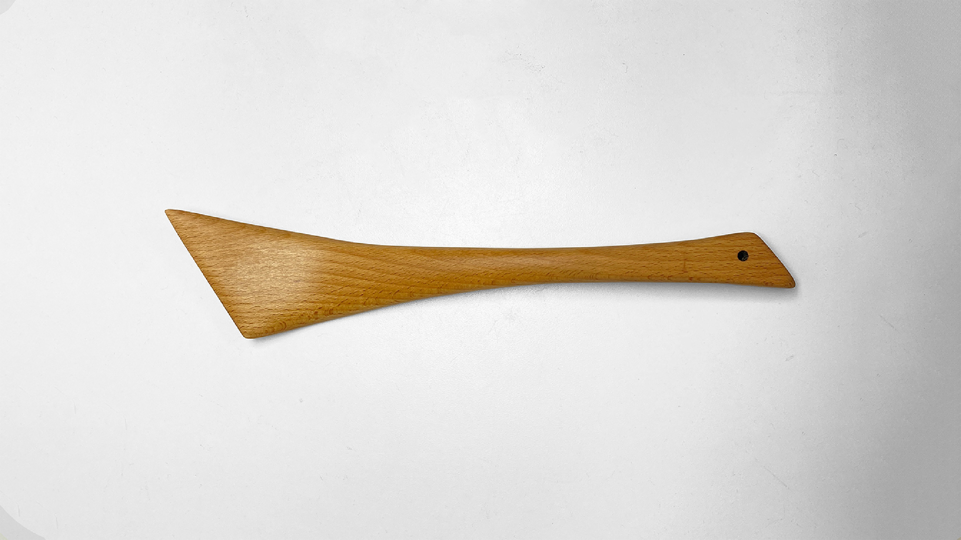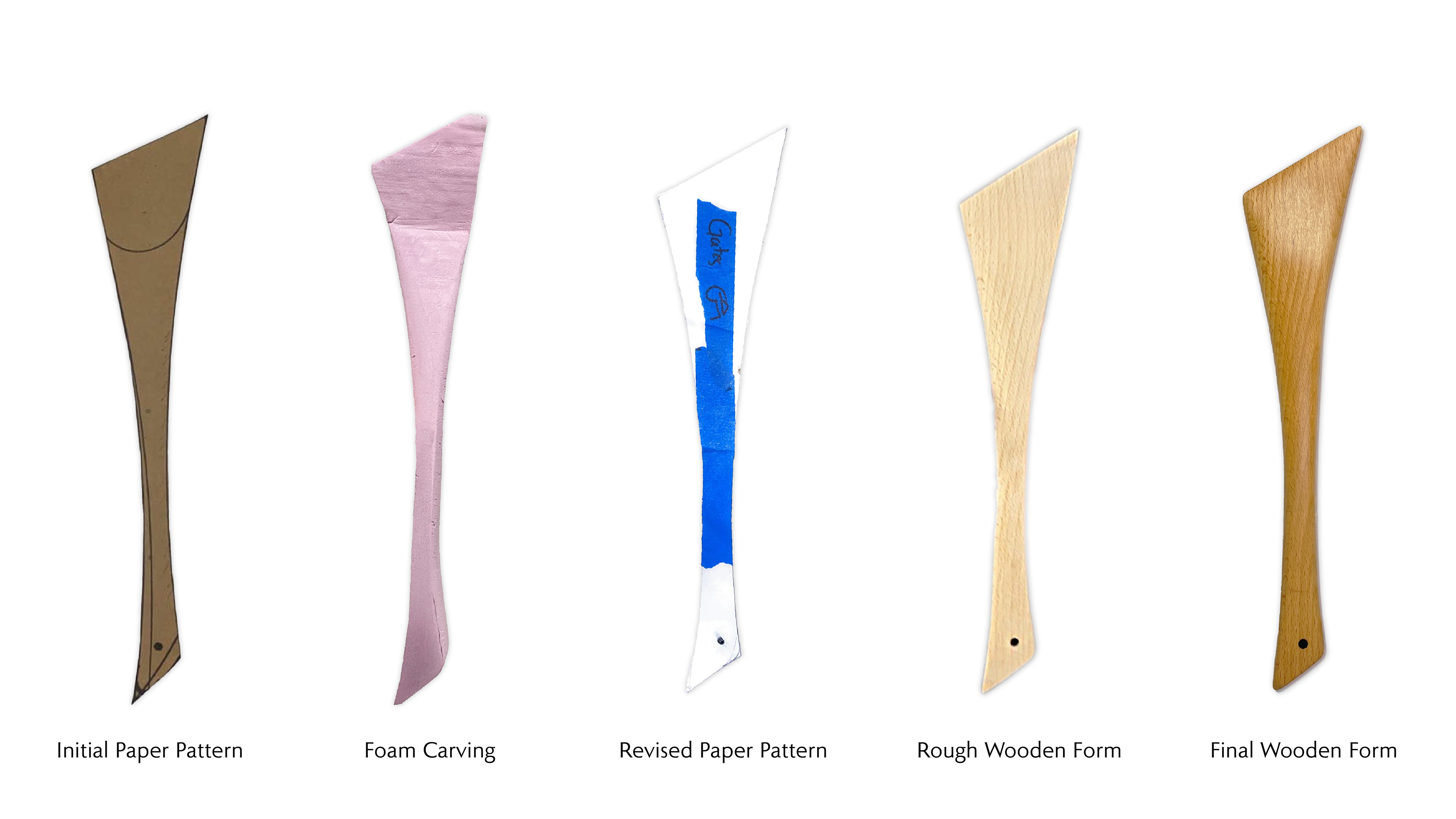 The sketch was transferred to a foam block, where it was carved. Once the form was finalized, the pattern was revised and the spatula was shaped in European beech wood.