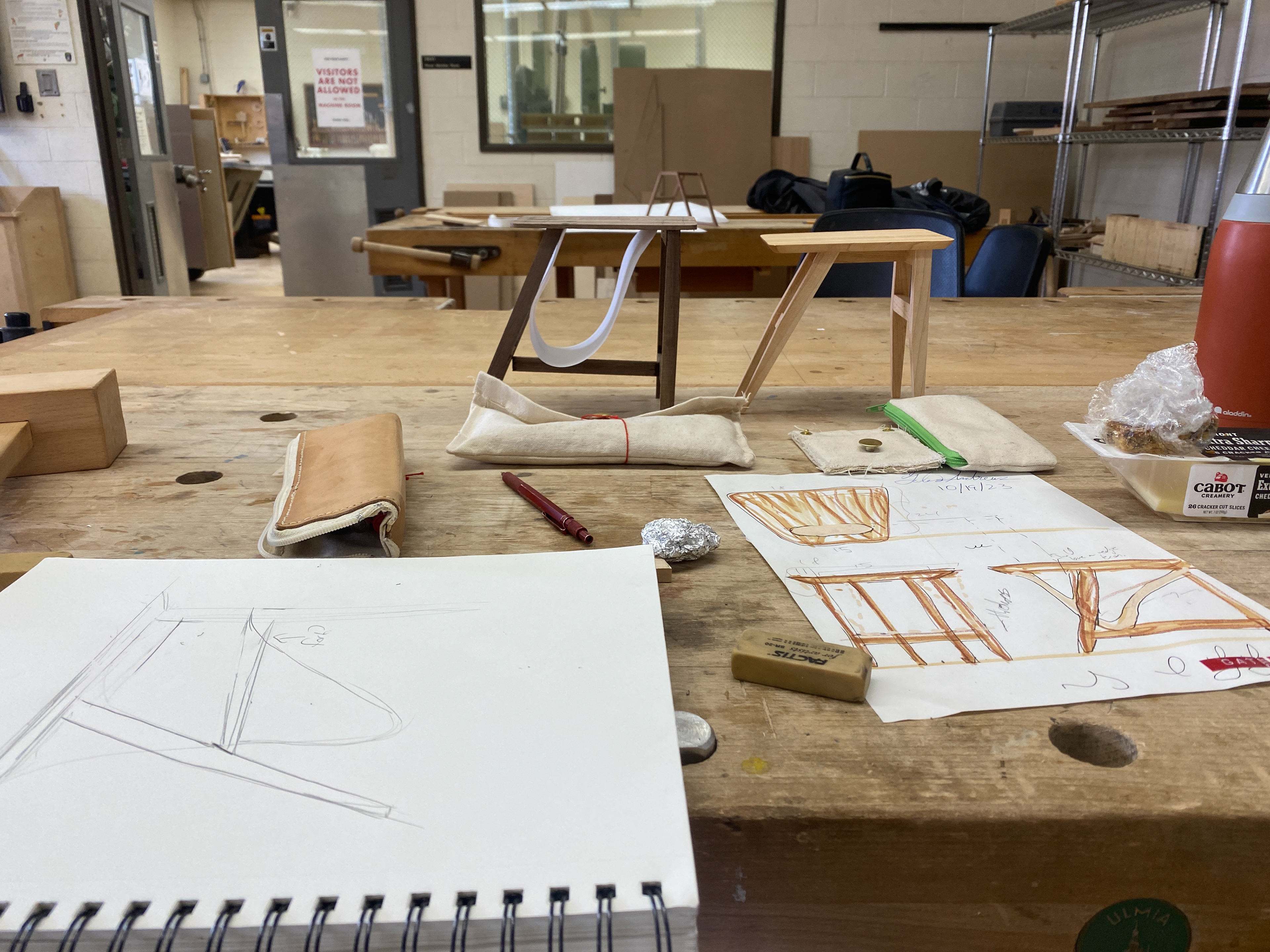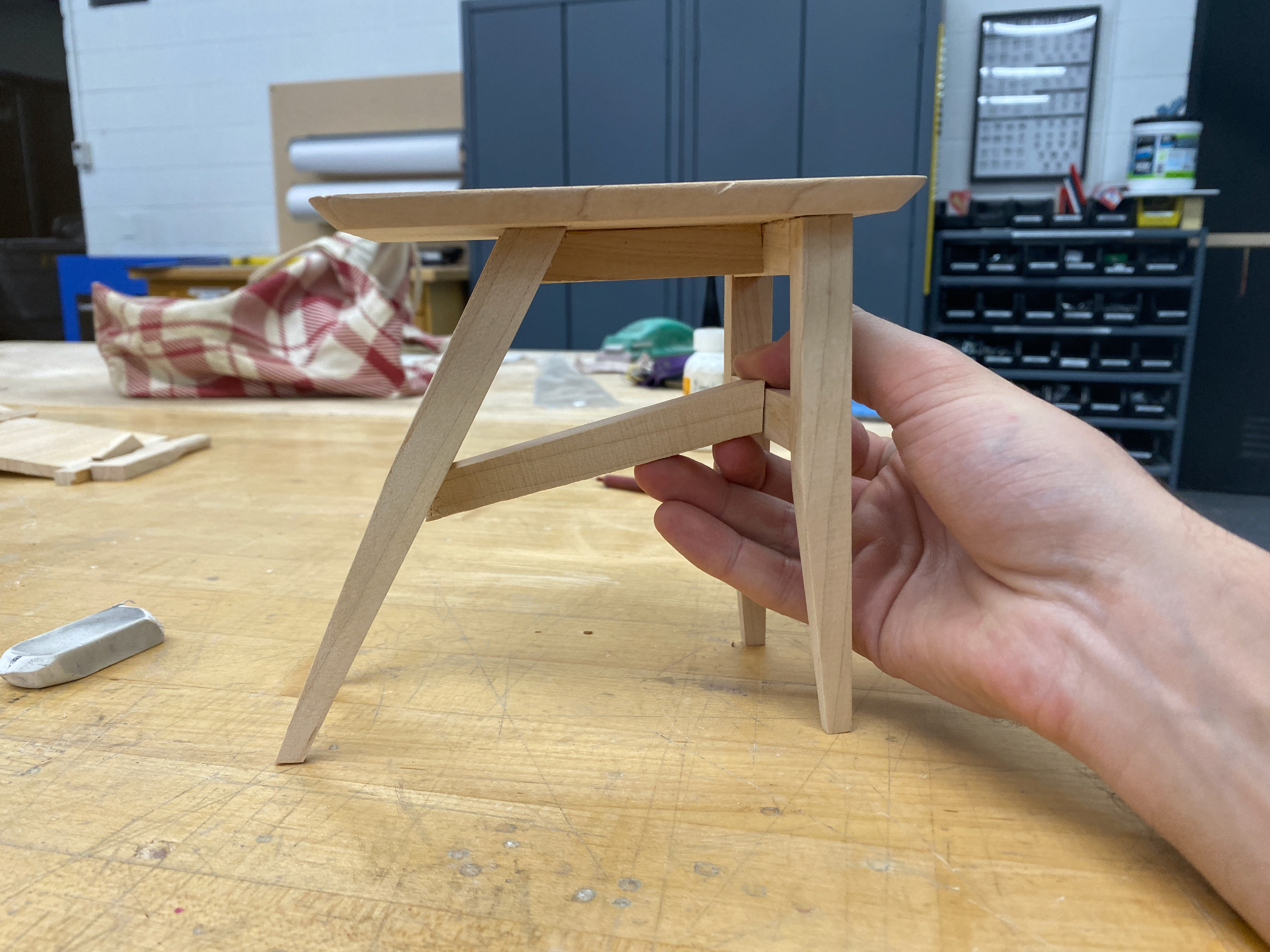 The design moved forward with making an asymmetrical table with a tapered top, with a fabric sling to hold books.