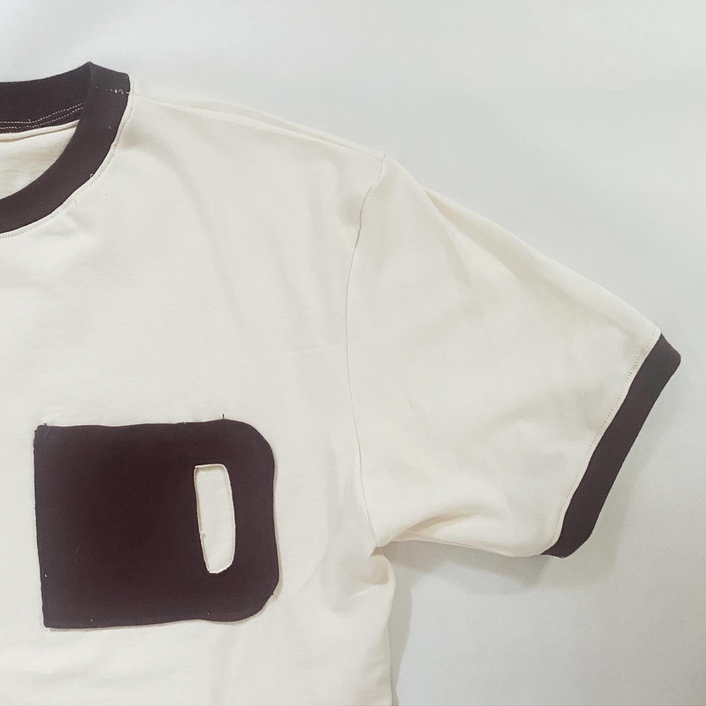 The Rib Tee's high neckline and construction is inspired by the vintage knit tees of the 1970s. The body is a single piece of fabric, closed at the back with an exposed contrast overlock stitch. This way, no seams touch the body.