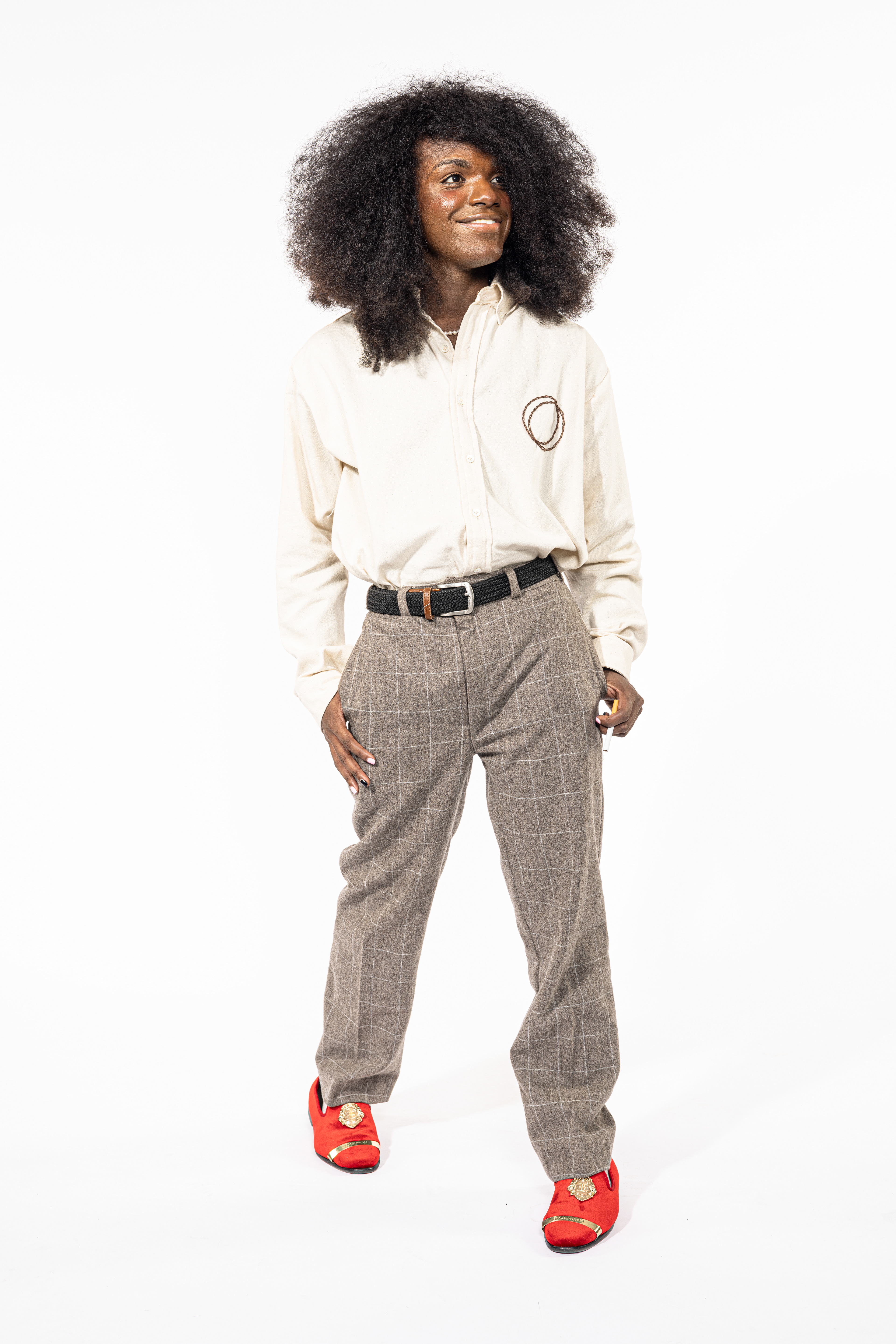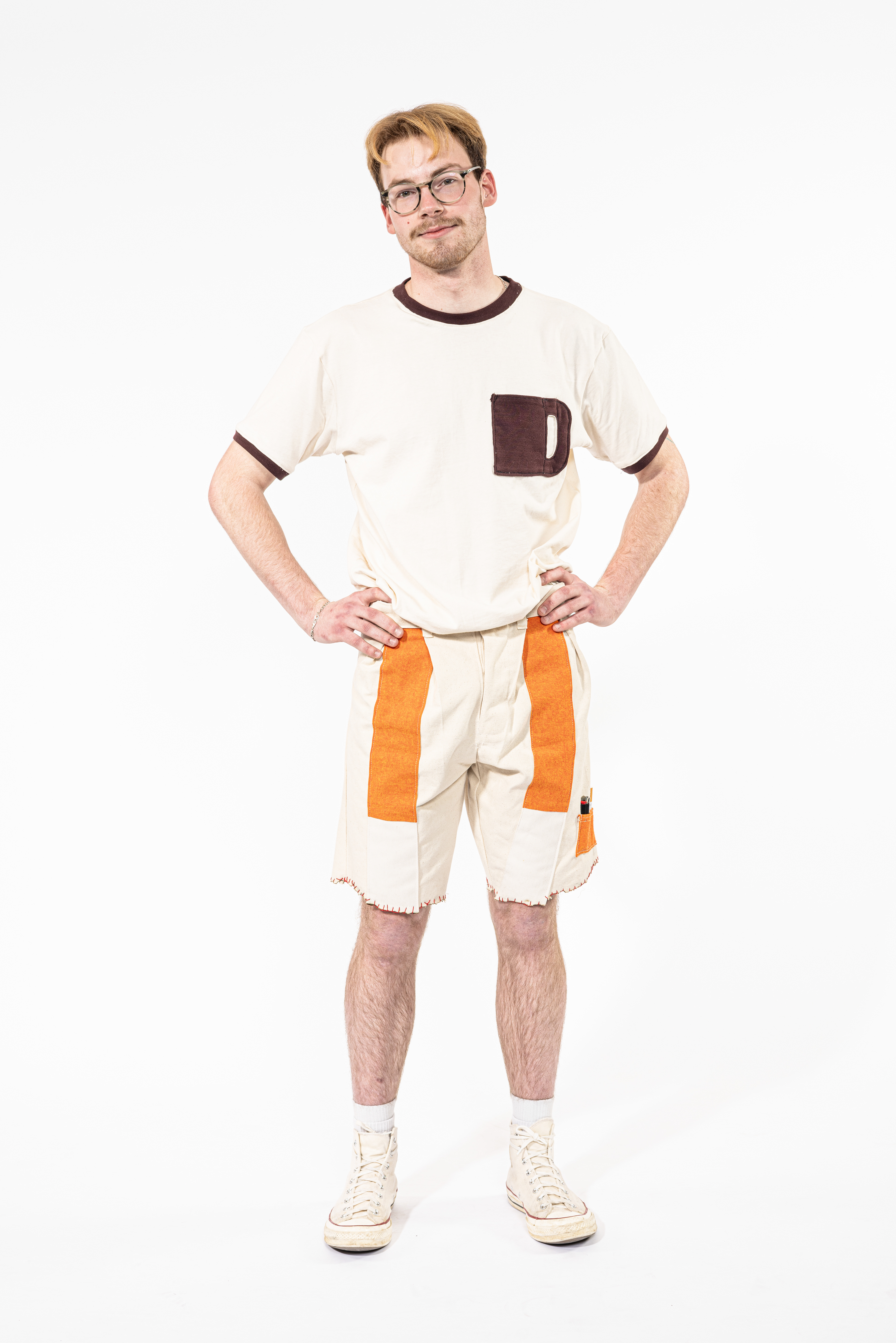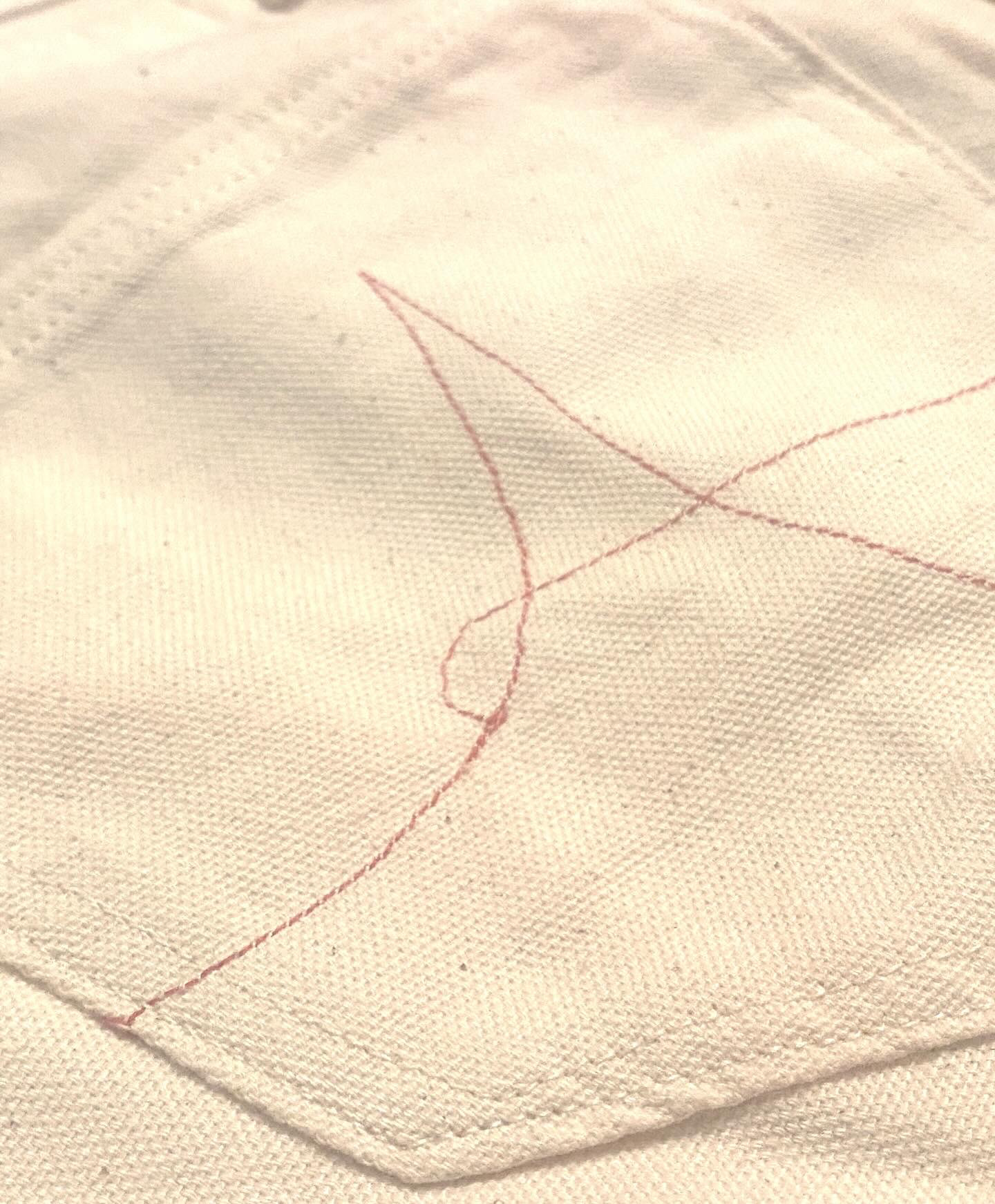 The Cigarette Pants have got it all, with pockets for a pack of reds, a pen, eight cigarettes, a lighter, and a pack of ZYN. Front pleats and appliqué panels exemplify a cigarette motif, featuring a burnt hem reinforced with a blanket stitch, as well as 100% cotton unbleached and undyed herringbone twill belt loops.
